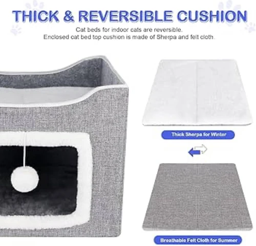 بيت قطط قابل للطي باللون الرمادي، ويحتوي على كهف مغلق للاختباء، وكرة لعبة متدلية، ومنصة علوية للاسترخاء