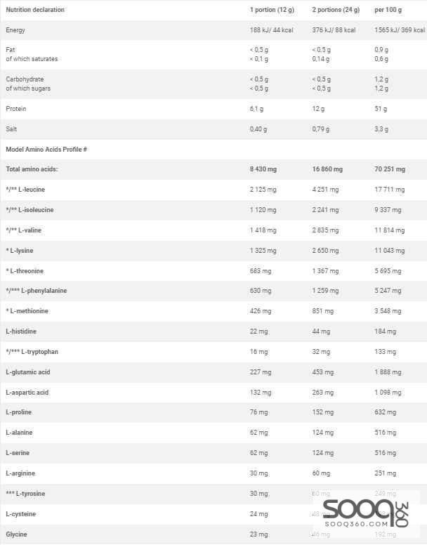 مسحوق اوليمب أمينو EAA Xplode - 520 جميعلم كل شخص يمارس الرياضة أن الأحماض الأمينية عنصر مهم في النظام الغذائي اليومي. لتلبية توقعات العملاء، قام المتخصصون في شركة Olimp Laboratories للأدوية، ذوي الخبرة في إنشاء مكملات غذائية عالية الجودة، بإعداد مستحضر من الأحماض الأمينية التي ستوفر كل حصة منها دعمًا مناسبًا للتغذية الصحية وستزود الجسم بأكثر من 8 جرام من الأحماض الأمينية العالية. -الأحماض الأمينية عالية الجودة!يعد مستحضر Olimp Amino EAA Xplode Powder منتجًا مصممًا للأشخاص النشطين بدنيًا والرياضيين. يتوفر المكمل من سلسلة Xplode Powder الشهيرة بالعديد من نكهات الفاكهة اللذيذة المنعشة للغاية، وتضمن قابلية ذوبانه الخالية من المتاعب أقصى قدر من الرضا مع كل مشروب جاهز. ثق بسنوات الخبرة العديدة التي تتمتع بها العلامة التجارية Olimp Sport Nutrition. اختار مسحوق Olimp Amino EAA Xplode! إنه مصدر مركز للأحماض الأمينية لك ولنظامك الغذائي اليومي!تكملة النظام الغذائي بالأحماض الأمينية BCAA وEAAأكثر من 8 جرام من BCAA وEAA في كل جرعة!يوصى به للأشخاص النشطين بدنيًا والرياضيين أثناء فترة التدريبنكهات لذيذة ومنعشةومن الجدير بالذكر أن منتج Olimp Sport Nutrition لا يمكن اعتباره بديلاً لنظام غذائي متوازن، بل مجرد مكمل له. لا تنس أسلوب الحياة الصحي والنظام الغذائي المتنوع.مكونات:الأحماض الأمينية [L- ليوسين، L- ليسين حمض الهيدروكلوريك، L- فالين، L- آيزوليوسين، L- ثريونين، L- فينيل ألانين، L- ميثيونين]، منظمات الحموضة - حامض الستريك، سترات الصوديوم، هيدروليزات بروتين مصل اللبن (من الحليب)، النكهات، عامل مضاد للتكتل - ثاني أكسيد السيليكون؛ المحليات - اسيسولفام K، السكرالوز. الألوان: الكاروتينات (A)، القرمزي (B)، الريبوفلافين (C)، E 150c (D)، E 150d (E)، E 133 (F)، الأزرق اللامع V (G)، النيلي القرمزي (H)، الكلوروفيل و الكلوروفيلين (I)، الكركمين (J)، الأنثوسيانين (K)، مستخلص البابريكا (L)، البيتانين (M)، الكربون النباتي (N).(A)-(Z) – اعتمادًا على نكهة المنتج للمكونات المستخدمة، انظر الرموز (A-Z) بجانب تاريخ الحد الأدنى من المتانة (الأفضل قبل).يتم تصنيعه في موقع إنتاج يستخدم مشتقات الحليب والبيض وفول الصويا والمكسرات والفول السوداني والحبوب التي تحتوي على الغلوتين والأسماك والقشريات والرخويات.