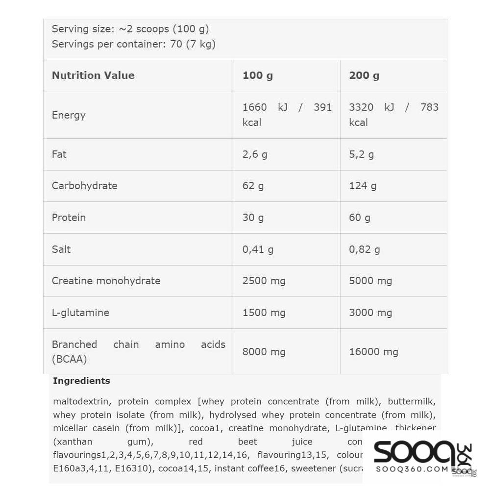 7 كجمرابح الجيل الجديد. مسحوق Mass Gainer لتحضير مشروب البروتين والكربوهيدرات الغذائي الغني بالكرياتين والجلوتامين. مصممة للبالغين الذين يقومون بتمارين عالية الكثافة. إمداد غذائي. مع التحلية.- يساهم في نمو الكتلة العضلية،- يساهم في الحفاظ على كتلة العضلات،- يساهم في الحفاظ على العظام الطبيعية.تساهم الكربوهيدرات في استعادة وظيفة العضلات الطبيعية (الانكماش) بعد ممارسة تمارين بدنية مكثفة للغاية و/أو طويلة الأمد مما يؤدي إلى إرهاق العضلات واستنزاف مخازن الجليكوجين في العضلات الهيكلية*المنتج مخصص للبالغين الذين قاموا بتمارين بدنية مكثفة للغاية و/أو طويلة الأمد مما أدى إلى إرهاق العضلات واستنفاد مخازن الجليكوجين في العضلات الهيكلية.* يتم الحصول على التأثير المفيد من خلال استهلاك الكربوهيدرات، من جميع المصادر، بجرعة إجمالية قدرها 4 جرام لكل كجم من وزن الجسم، خلال الأربع ساعات الأولى وفي موعد لا يتجاوز 6 ساعات، بعد ممارسة مكثفة للغاية و/أو طويلة - ممارسة التمارين الرياضية بشكل دائم مما يؤدي إلى إرهاق العضلات واستنزاف مخازن الجليكوجين في العضلات الهيكلية.يزيد الكرياتين من الأداء البدني في دفعات متتالية من التمارين قصيرة المدى وعالية الكثافة. يتم الحصول على تأثير مفيد مع تناول 3 جرام من الكرياتين يوميًا.مكوناتمالتوديكسترين، مركب البروتين [تركيز بروتين مصل اللبن (من الحليب)، اللبن، بروتين مصل اللبن المعزول (من الحليب)، مركز بروتين مصل اللبن المتحلل (من الحليب)، كازين ميسيلار (من الحليب)]، كاكاو 1، كرياتين مونوهيدرات، إل-جلوتامين، مثخن. (صمغ الزانثان)، مركز عصير البنجر الأحمر 7،10،12، المنكهات 1،2،3،4،5،6،7،8،9،10،11،12،14،16، المنكهات 13،15، اللون / الألوان ( E150c2,3,9, E160a3,4,11, E16310)، كاكاو 14,15، قهوة سريعة التحضير 16، محلي (سكرالوز).