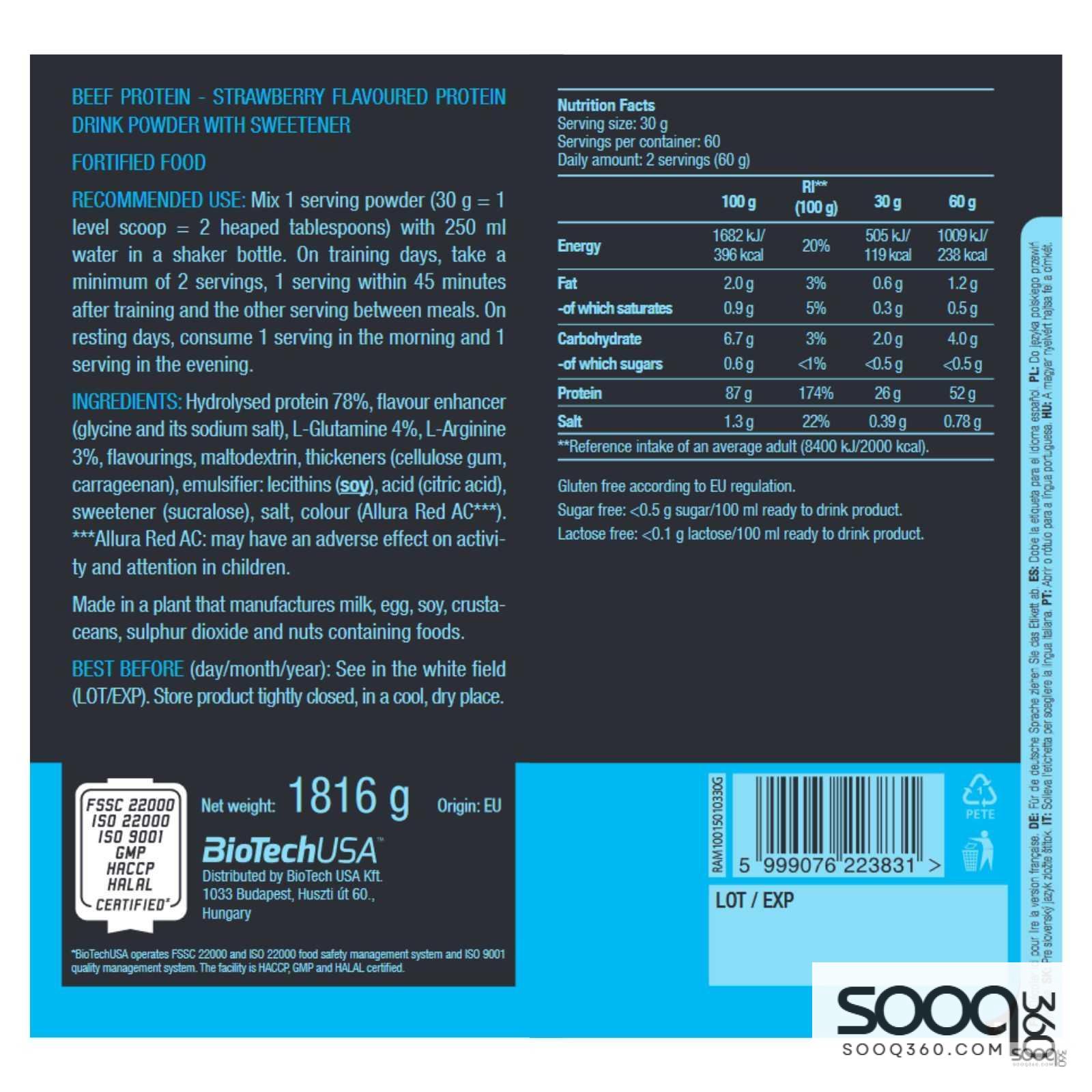 يعتبر بروتين لحم البقر مصدرًا ممتازًا للبروتين لأي شخص؛ فهو يساهم في الحفاظ على صحة العظام والكتلة العضلية، وكذلك نمو الكتلة العضلية.أولئك الذين يبحثون عن بروتين غير الحليبمثالي أيضًا لنظام غذائي باليوأولئك الذين يتبعون نظامًا غذائيًا خاليًا من الحليبتلك الحساسة لللاكتوزتلك الحساسة للجلوتينمثل جميع منتجات BioTech USA، يتكون بروتين البقر من مكونات آمنة ومختارة بعناية.