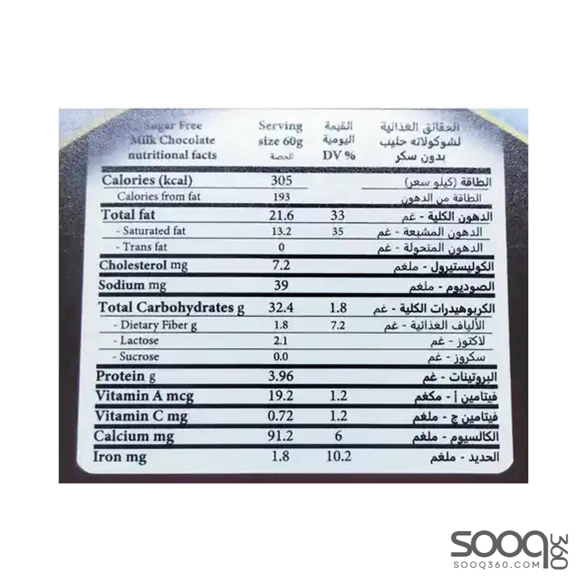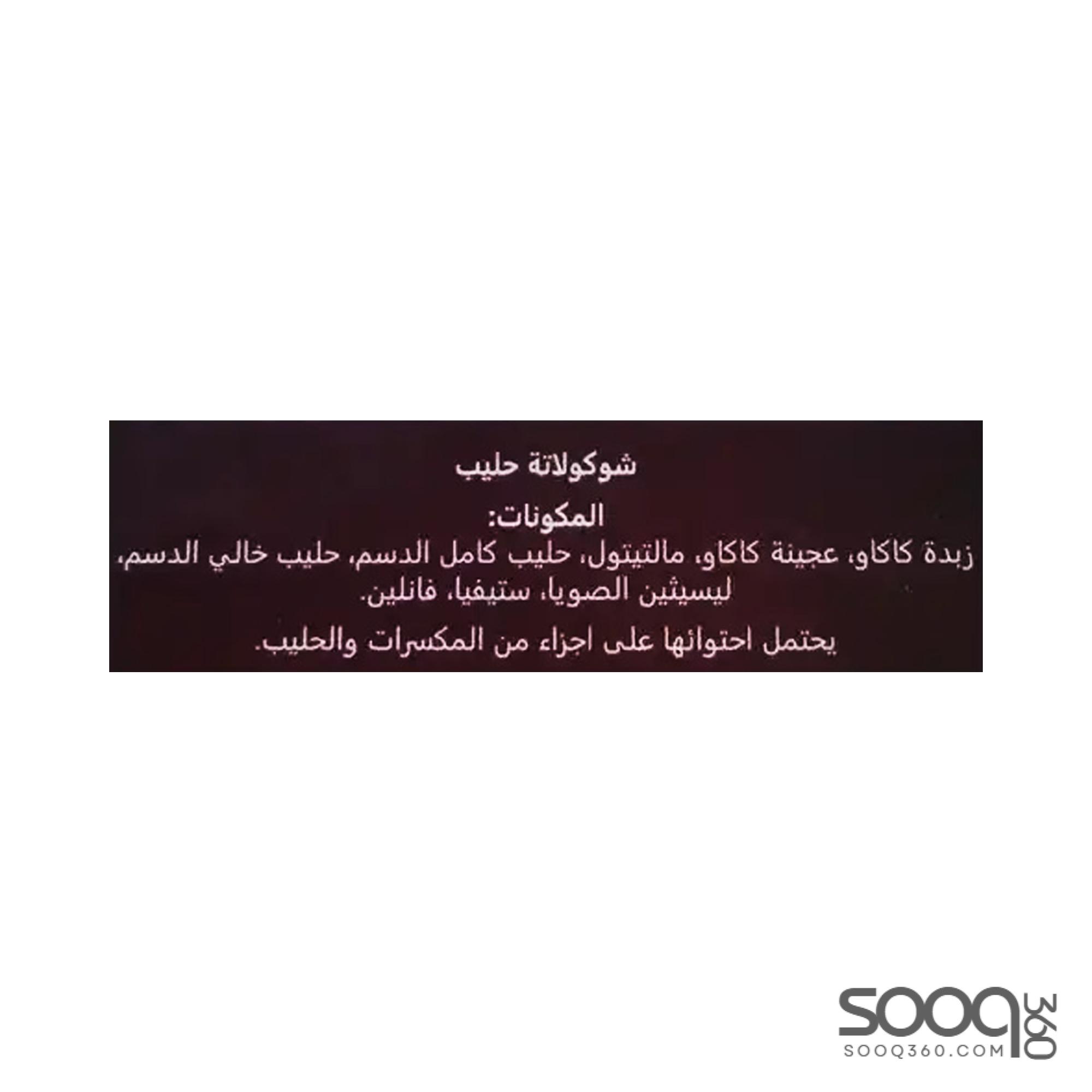 شوكلاته بالحليب صنعت مع محلي ستيفيا خالي من مشتقات الخنزير خالي من المواد الحافظة خالي من الجلوتين قد تحتوي على : مكسرات ، حليب