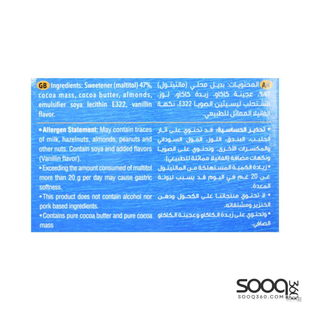 شوكولاتة داكنة باللوز بدون سكر مضاف قد تحتوي على البندق واللوز والمكسراتقد تحتوي على الحليب والصويالا تحتوي على دهن الخنزيرلا يحتوي على الكحول