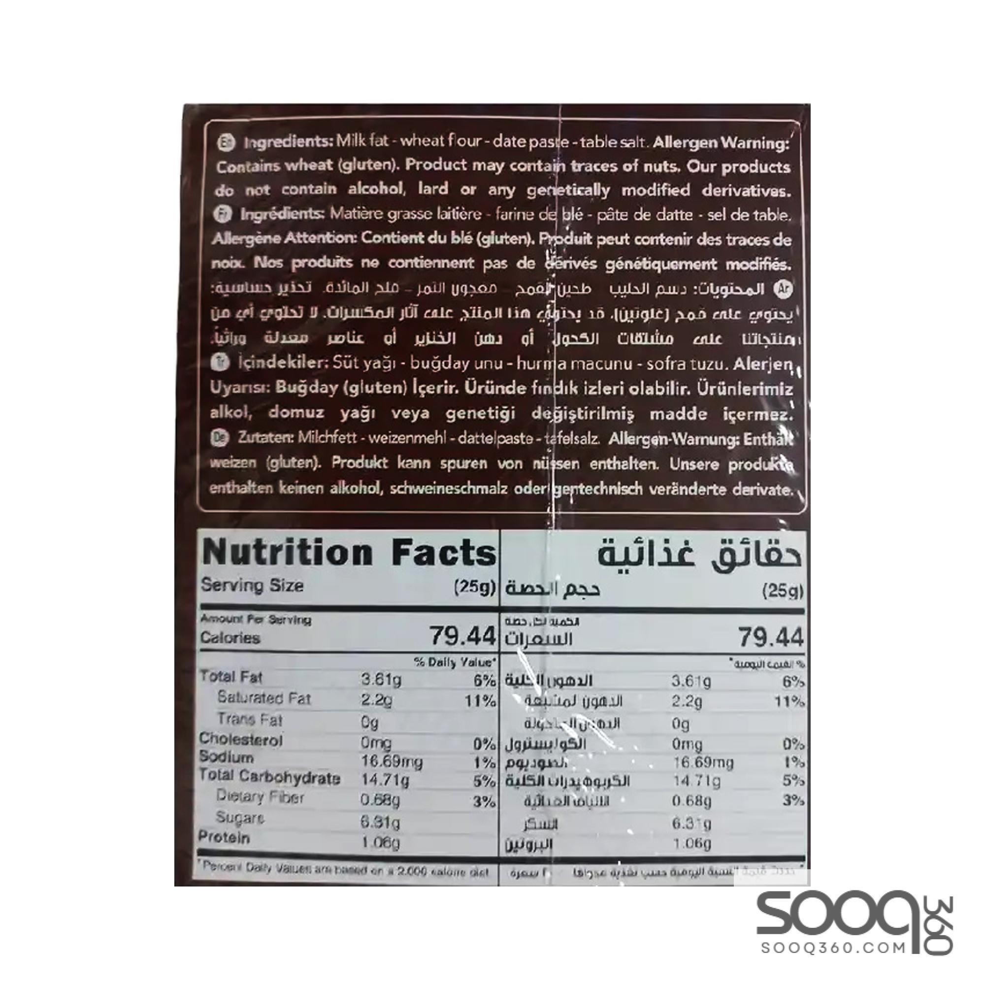 معمول تمرالخلطة الاصلية خالي من السكر المضاف يحتوي على القمح يحتوي على اثار المكسرات لا تحتوي على مشتقات الكحول او دهن الخنزير لا يحتوي على عناصر معدلة وراثيا