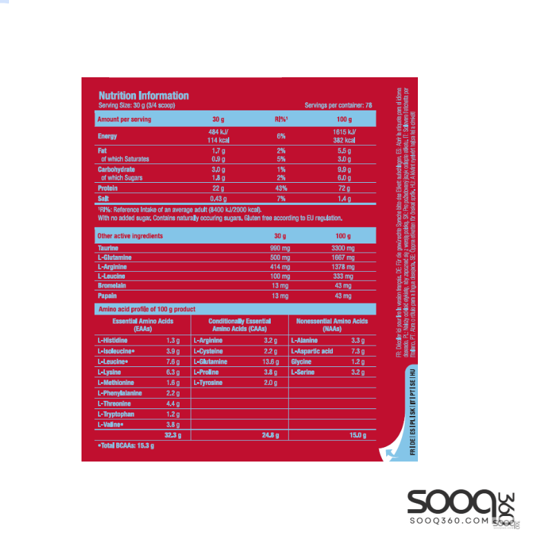 100% Whey Protein Professional عبارة عن مزيج بروتين مصل اللبن عالي الجودة مع مصل اللبن المركز ومصل اللبن المعزول. البروتينات الغذائية هي مصدر النيتروجين والأحماض الأمينية التي لا غنى عنها، والتي يحتاجها الجسم لنمو الأنسجة وصيانتها. لذلك، يساهم بروتين مصل اللبن بنسبة 100% في نمو كتلة العضلات والحفاظ عليها، وكذلك في الحفاظ على العظام الطبيعية*. بروتين مصل اللبن من الحليب هو ما يسمى بالبروتين الكامل، لأنه يزود الجسم بجميع أنواع الأحماض الأمينية الضرورية، بما في ذلك الأحماض الأمينية التسعة التي لا يستطيع الجسم تصنيعها ويجب توفيرها عن طريق النظام الغذائي (مثل الهيستيدين، آيزوليوسين، ليوسين، ليسين، ميثيونين، فينيل ألانين، ثريونين، تريبتوفان، فالين). يحتوي 100% Whey Protein Professional على المزيد من المكونات المضافة: "مصفوفة الأحماض الأمينية" التي توفر الأحماض الأمينية الإضافية الشائعة، وهي L-Leucine وL-Glutamine وTaurine. أيضًا، تم تضمين مزيج الإنزيم الهضمي من البابين والبروميلين في تركيبتنا!