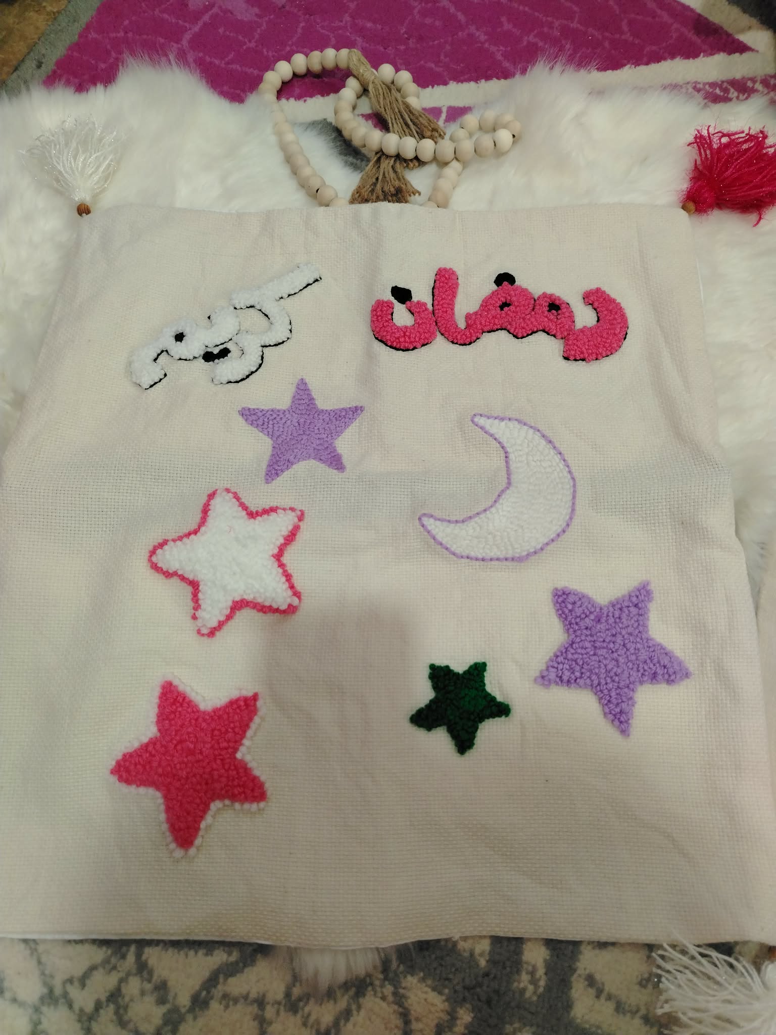 قطعة تطريز يدوية مميزة تعكس روح شهر رمضان المبارك من خلال تصميم أنيق يجمع بين النجوم والهلال بألوان زاهية وجذابة. مثالية لتزيين منزلك أو كهدية رمضانية تعبر عن الأجواء الروحانية والبهجة في هذا الشهر الفضيل. مصنوعة بخيوط ناعمة وبإبرة دقيقة تعكس مهارة وحب في كل غرزة، تضيف لمسة فنية وأصالة لأي مكان توضع فيه..