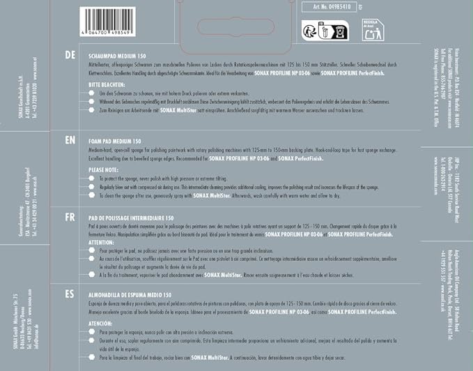 إسفنجة متوسطة الصلابة، عالية الكثافة وذات خلايا مفتوحة، مصممة خصيصًا للتلميع الآلي لطلاء السيارات باستخدام أجهزة التلميع الأوربيتالية (الدائرية العشوائية). تتميز بمتانة عالية ومقاومة ممتازة للحرارة بفضل التهوية الجيدة ونظام التبريد الخاص في المنتصف. مزودة بشريط لاصق (فيلكرو) لتبديل سريع وسهل للإسفنجة. توفر تحكمًا ممتازًا أثناء الاستخدام بفضل الحواف المائلة للإسفنجة. مناسبة لأطباق التثبيت بقطر 150 ملم. مثالية لاستخدام مع: