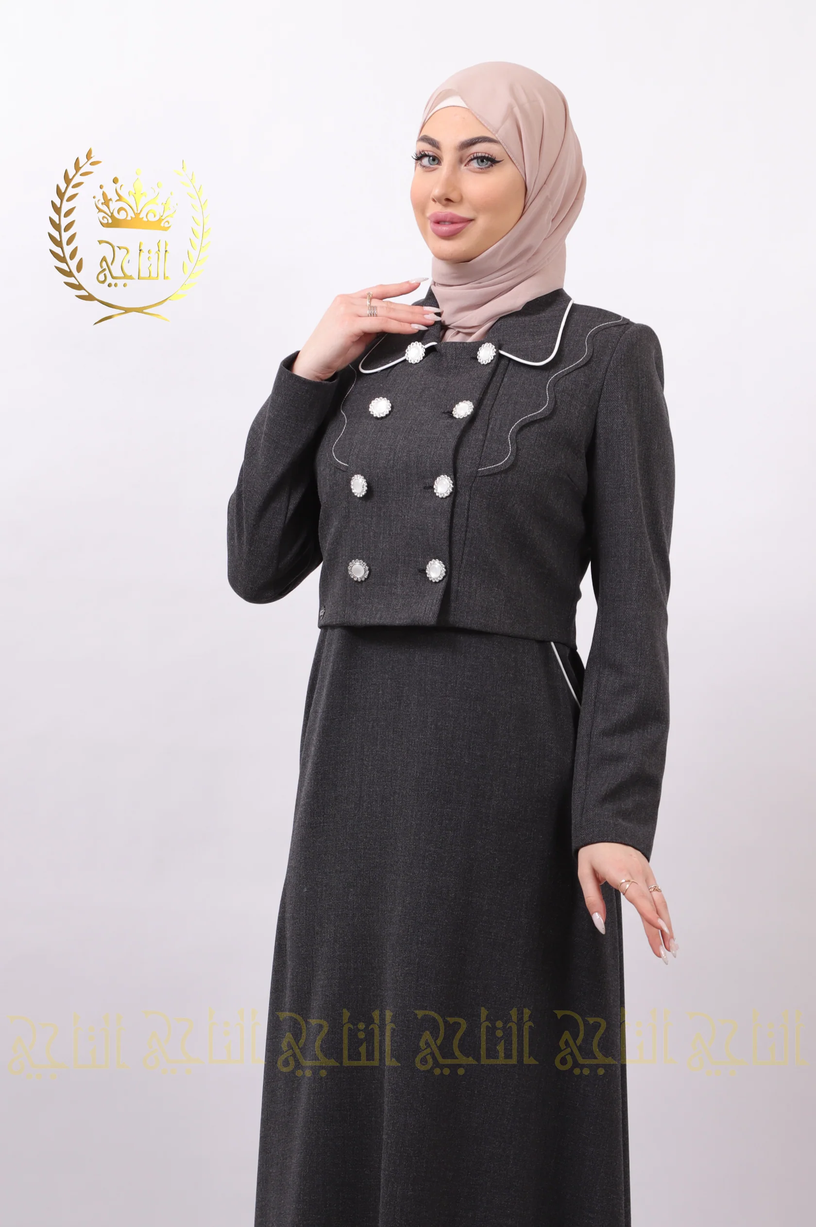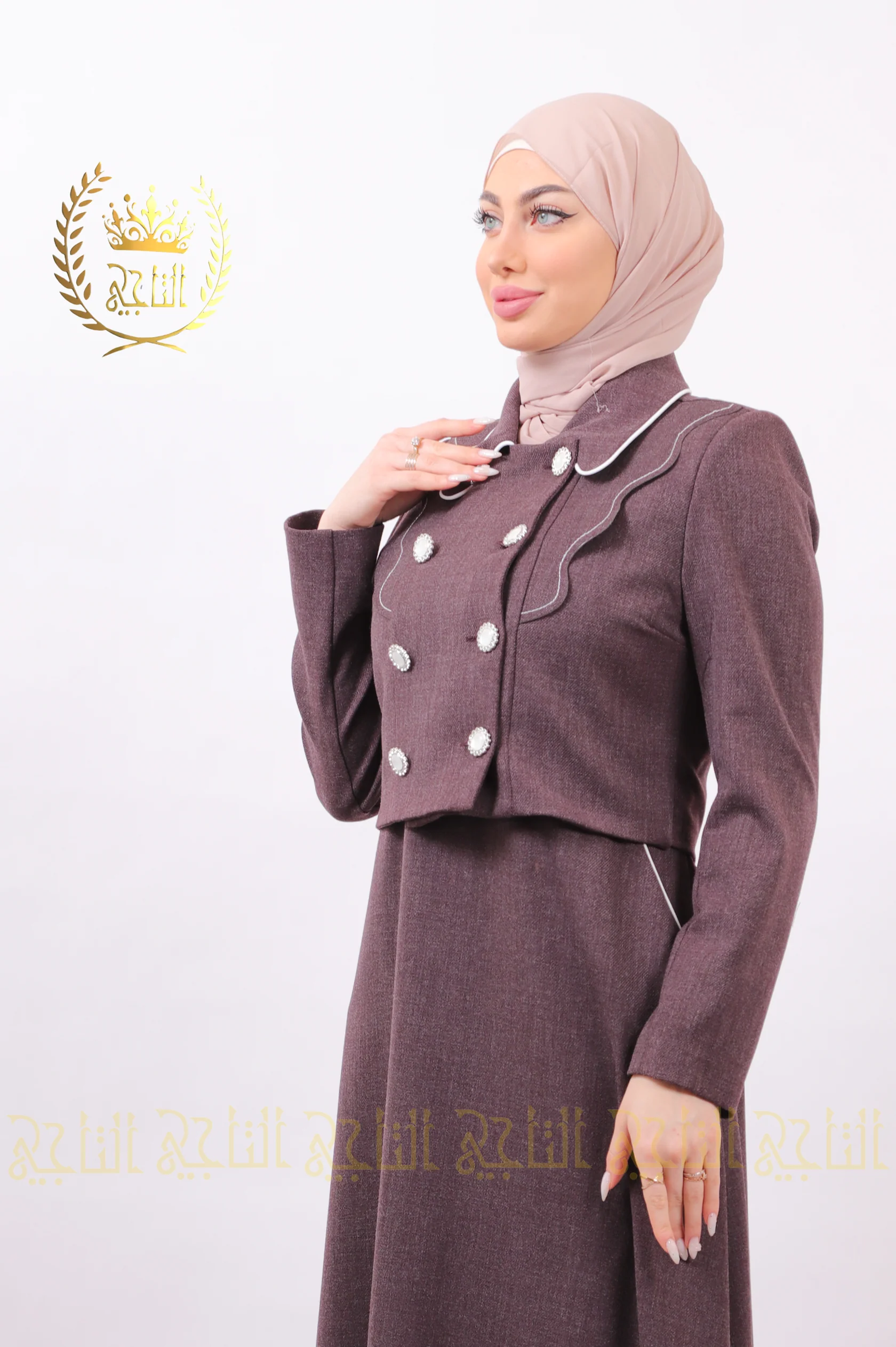 أناقة رسمية محتشمة! قطعة فريدة بتصميم مزدوج الأزرار وياقة متباينة، تجمع بين الجاكيت الأنيق والتنورة الطويلة. اطلبي مظهرك المتكامل وابحثي عن 'طقم جاكيت وتنورة محتشم' أو 'طقم بأزرار مزدوجة رسمية' لتجديد إطلالتك!"