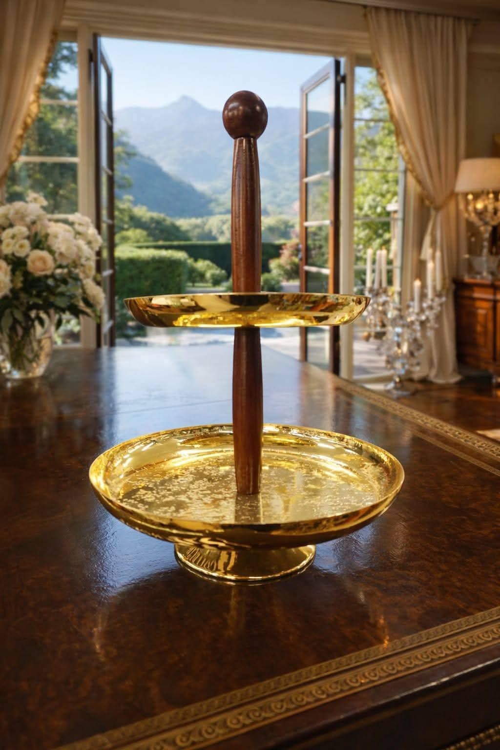 أضيفي لمسة من الفخامة الملكية إلى طاولتك مع حامل التقديم الذهبي ذو التصميم العصري واللمسة الخشبية الدافئة. القطعة المثالية التي تجمع بين الرقي والعملية في آن واحد.