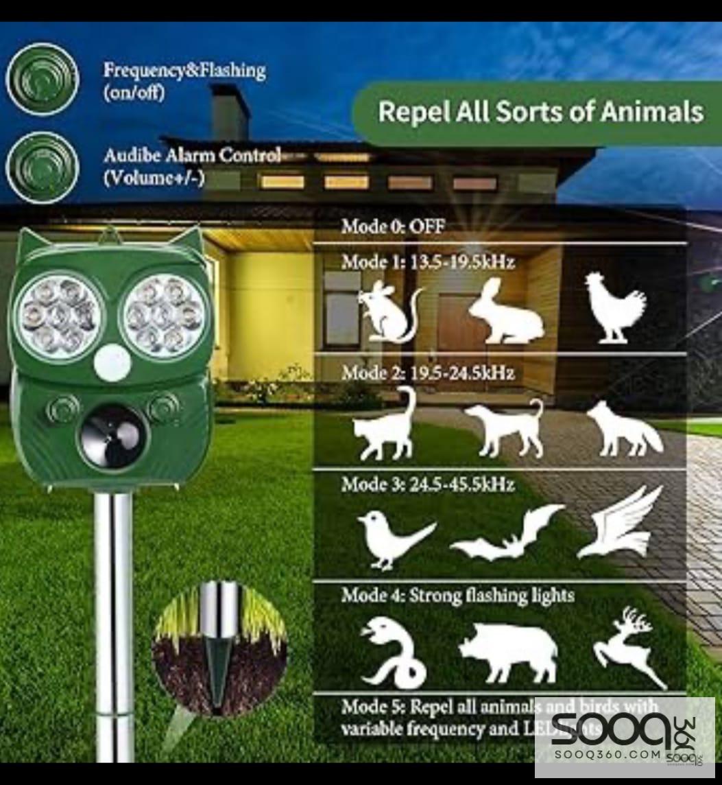 🔻 فزاعة وطارد 🔻3في 1 للحيونات والطيور والزواحف يعمل على الطاقة الشمسية تعمل 24 ساعه بموجات فوق الصوتية والضوئيّة وموجات سمعيه وتعمل على الكهرباء Usb