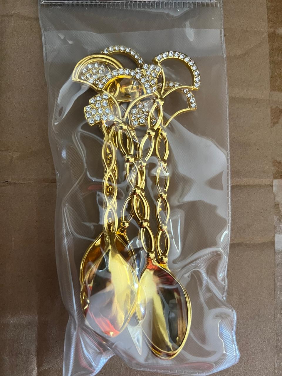 ارتقِ بتجربة الضيافة مع مجموعة الملاعق الفاخرة ذات التصميم المطلي باللون الذهبي والمرصعة بلمسات كريستالية جذابة. قطعة تجمع بين الرقي في التصميم والجودة في التفاصيل، لتكون الإضافة الأمثل لتقديم القهوة والحلويات.