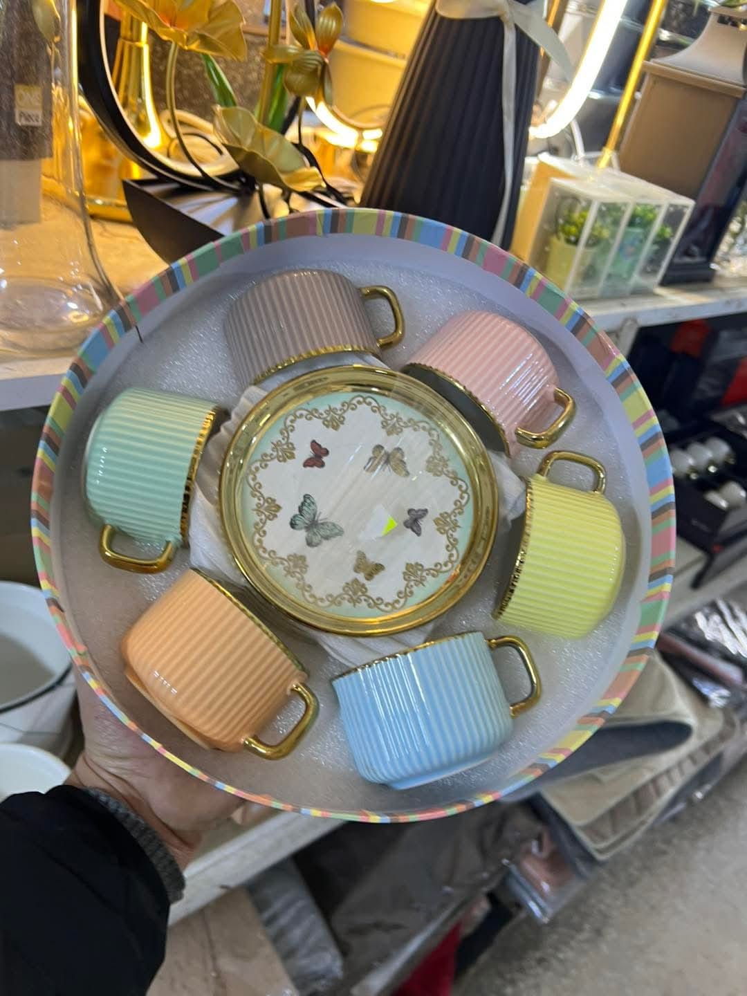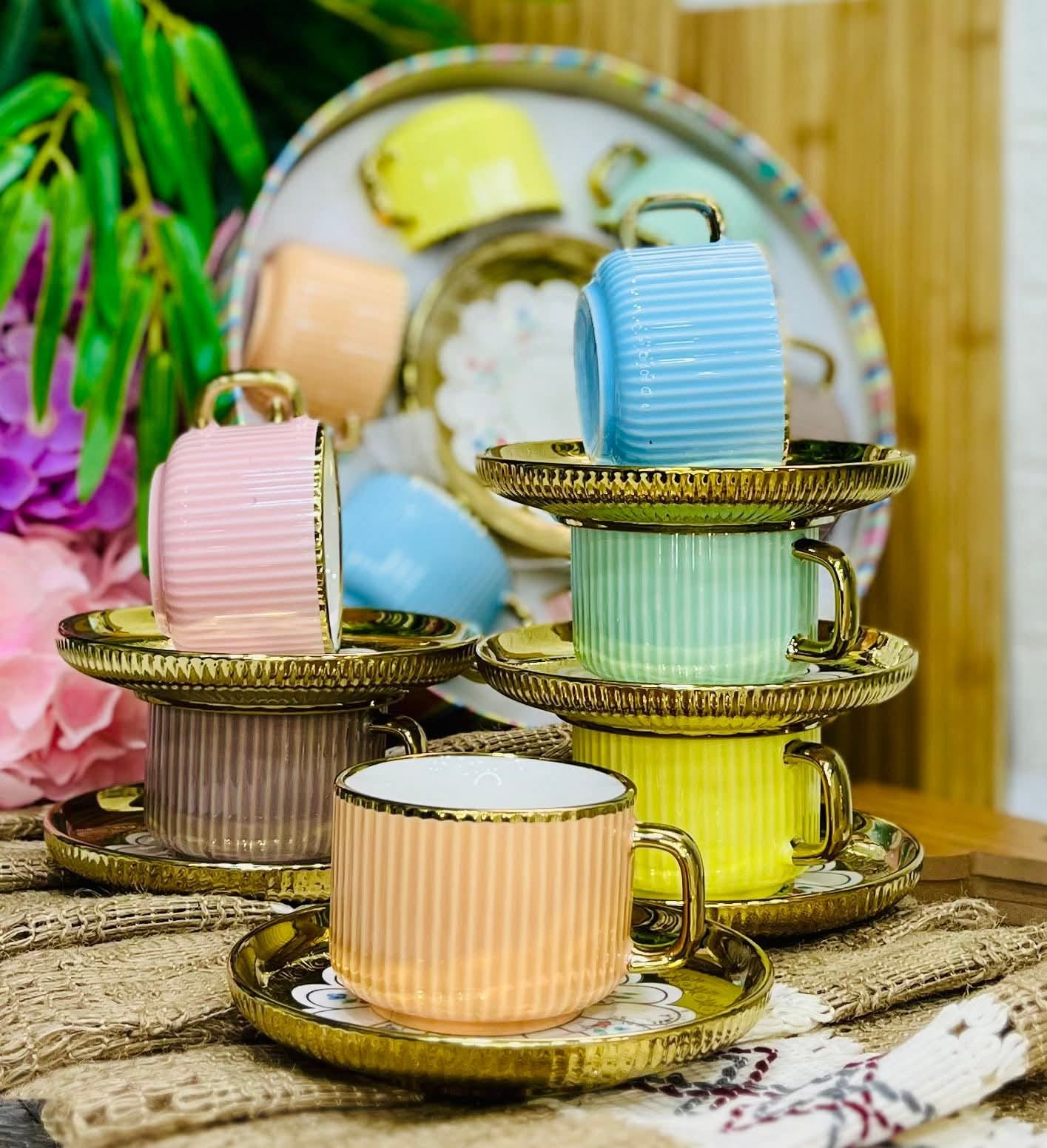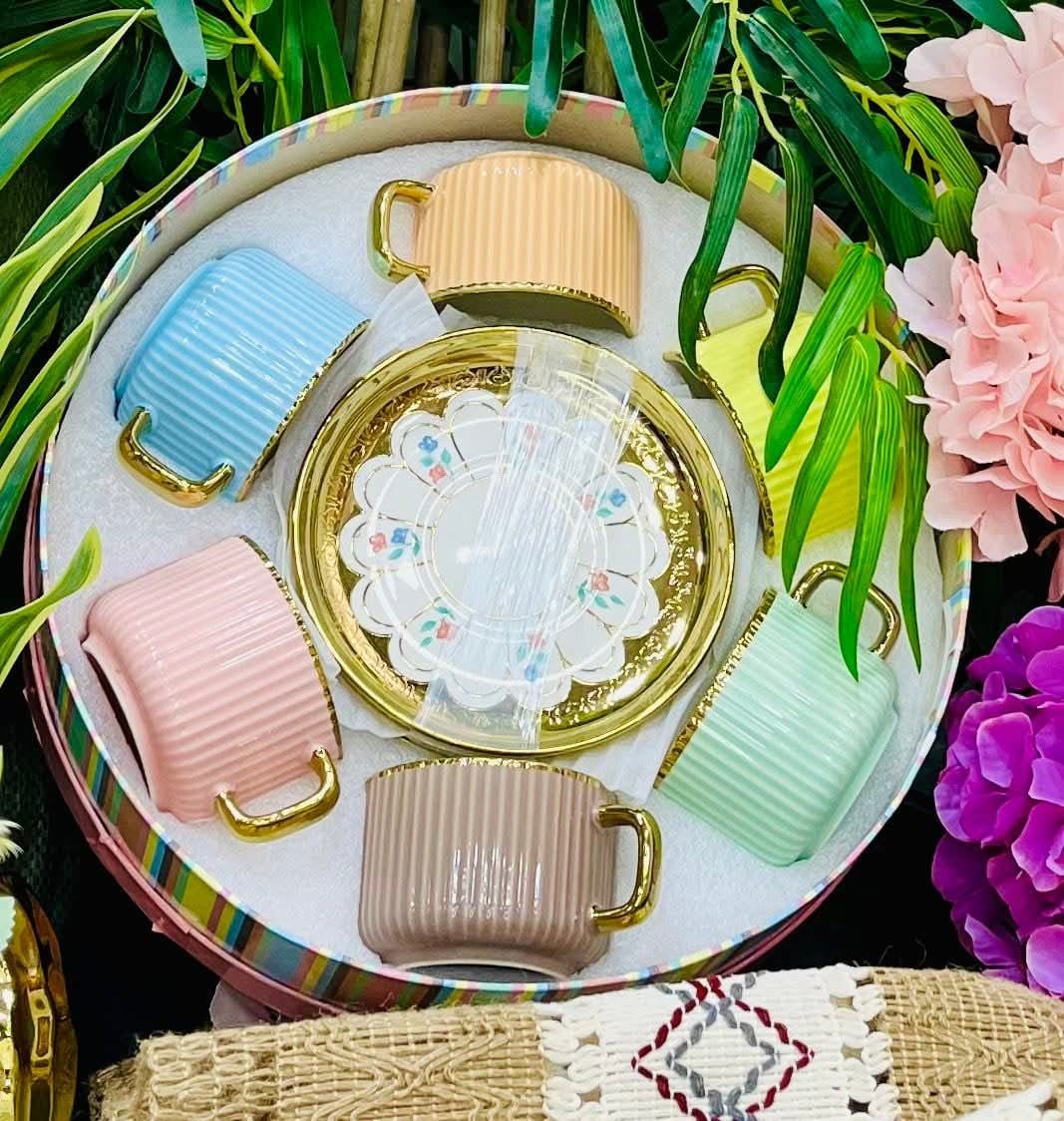 جددي طقم الضيافة لديكِ مع هذا الطقم الساحر الذي يجمع بين حيوية ألوان الباستيل وفخامة اللون الذهبي. يتميز الطقم بتصميم عصري ذو خطوط طولية بارزة، مع مقابض وحواف ذهبية تضفي لمسة من الأناقة الاستثنائية. يأتي الطقم مع صحون مزينة بنقوش الأزهار الناعمة ومغلف بصندوق هدايا دائري فاخر، مما يجعله هدية مثالية أو إضافة راقية لمائدتك.