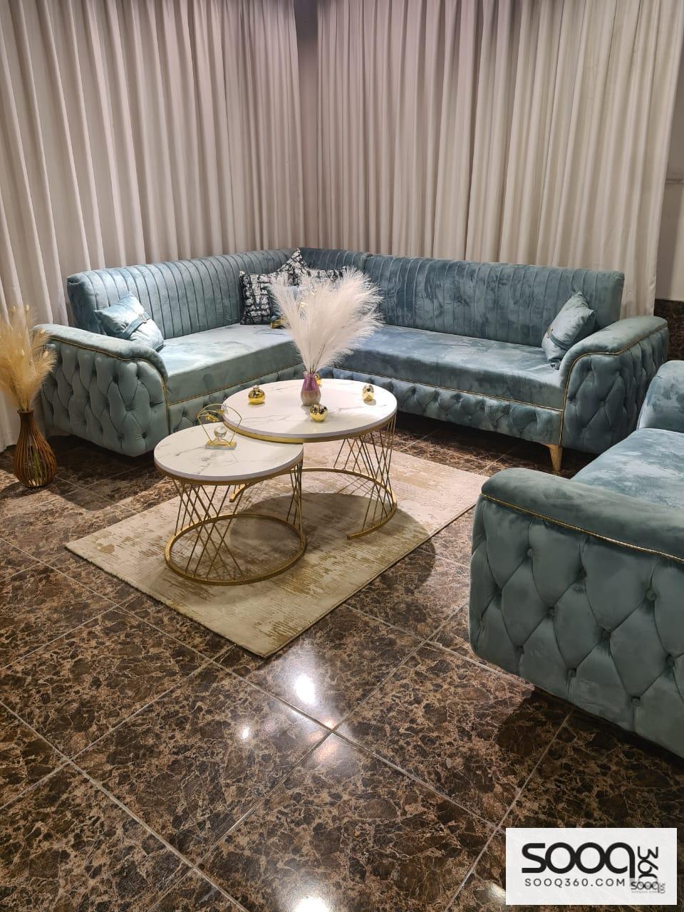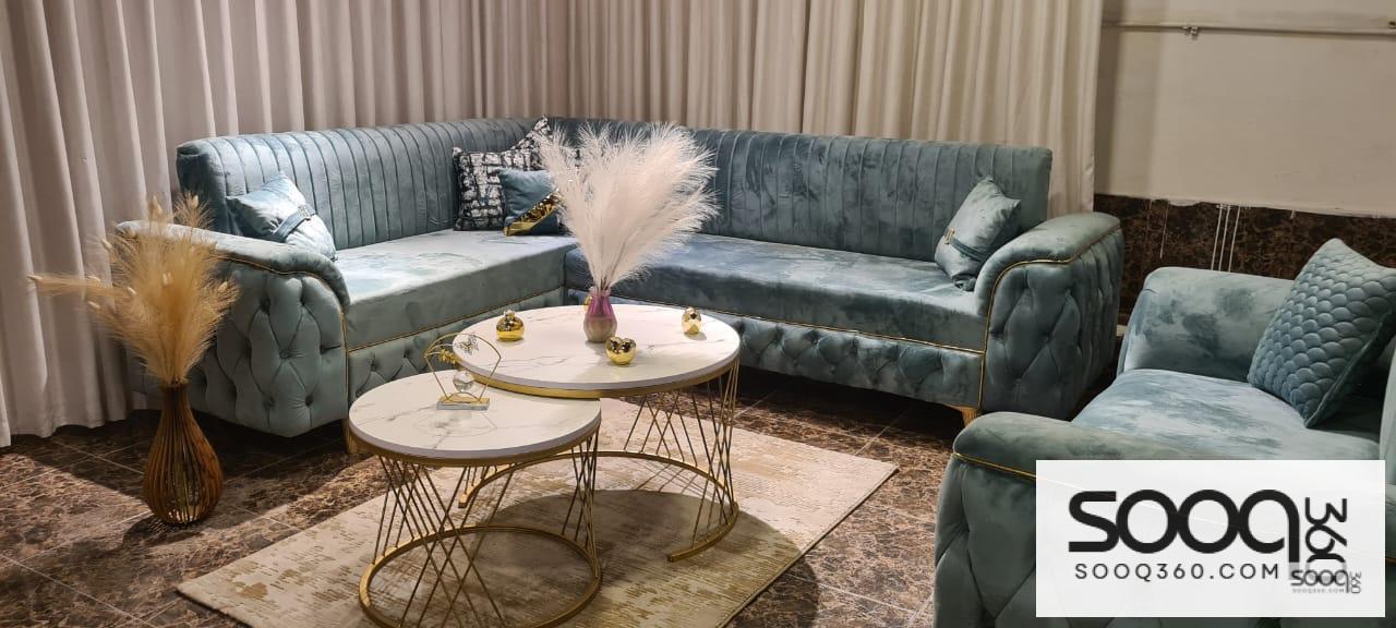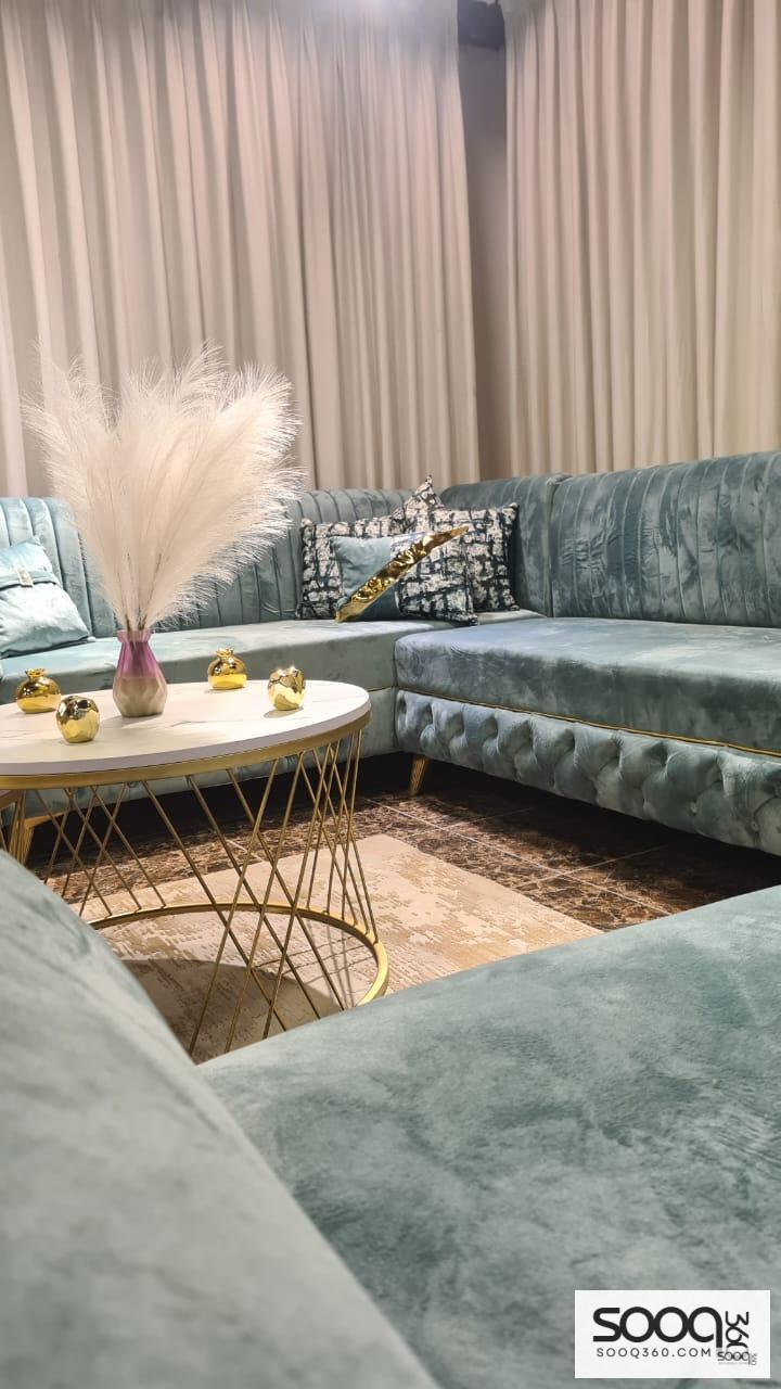 طقم كورنر ستايل تركي 9مقاعد خشب لاتيه وسويد و قماشة لينون تركي تركواز